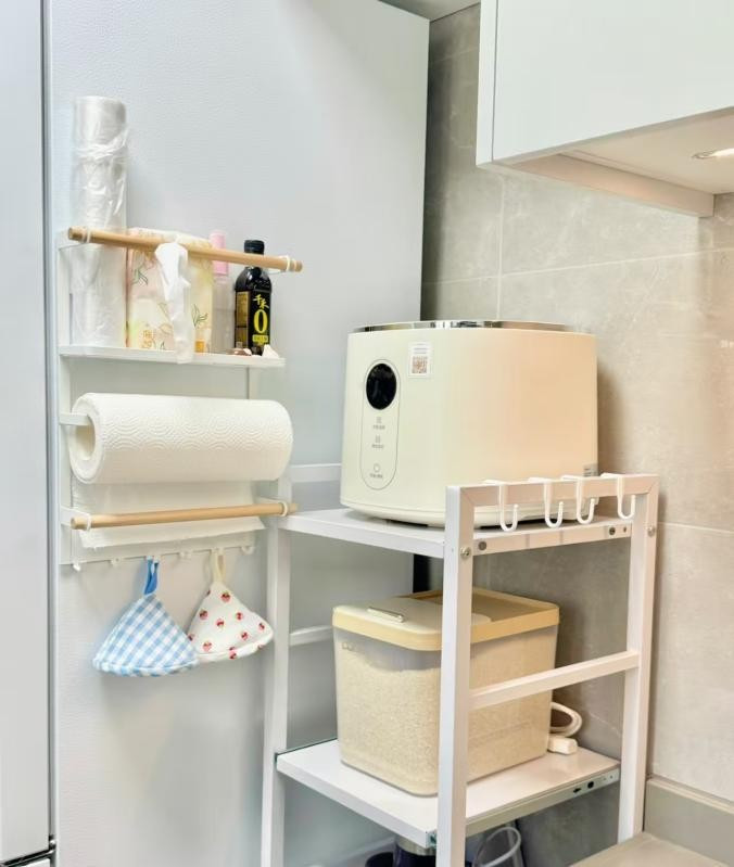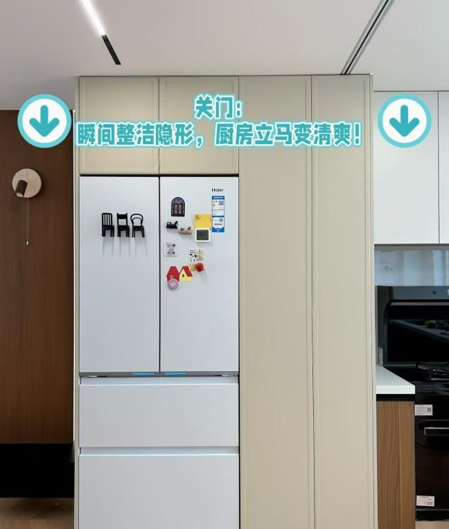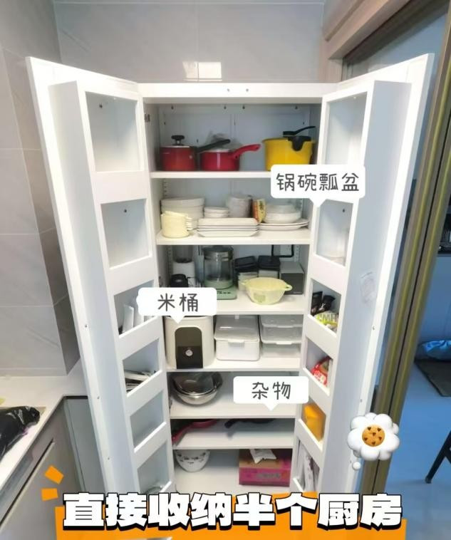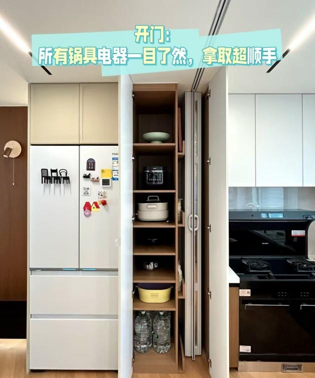 于是,他干脆做了一个冰箱尺寸的收纳柜,锅具、电器统统塞得下,侧开门还能顺手收纳调味品、杂粮、零食,利用率比原来放冰箱的时候高太多了。