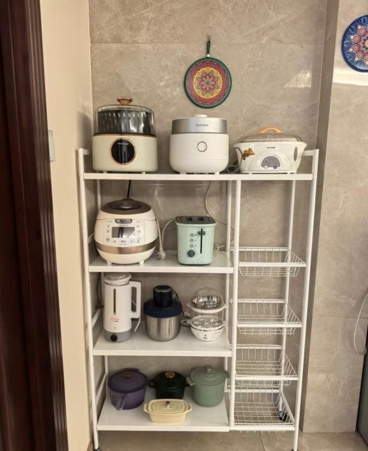 网友@甜茶不甜啊在橱柜里加了一个多层置物架,一层放一个锅,谁也别压谁。
