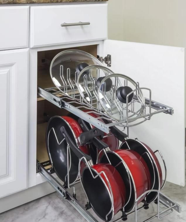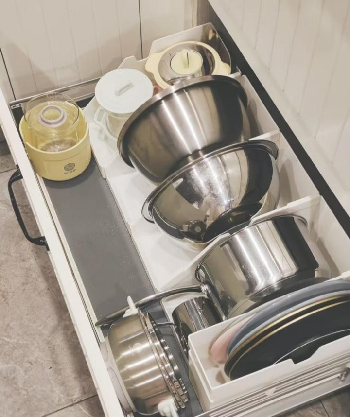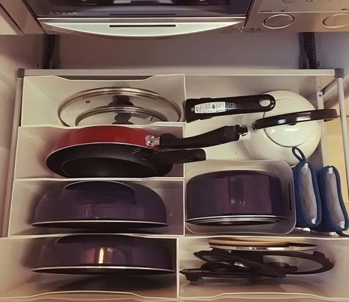 其实在收纳厨具、锅具时,这种抽屉分隔式收纳特别好用。把不同尺寸的锅分别立着摆放,看着更规整一些。
