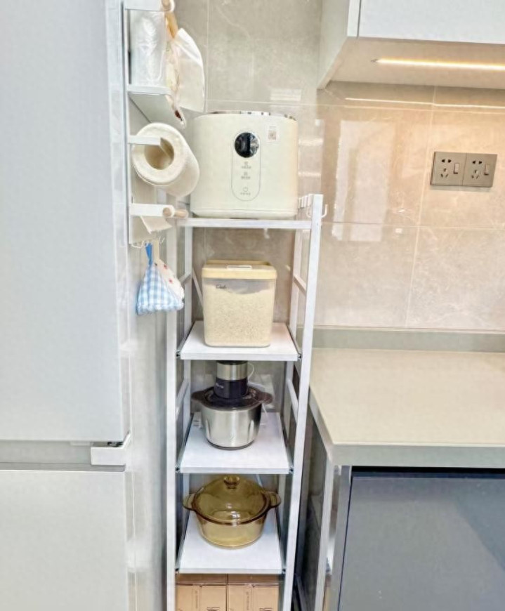 以前我家橱柜和冰箱中间那条缝,说它是空间,都有点抬举它了,放不下东西,塞点垃圾袋都嫌挤。
