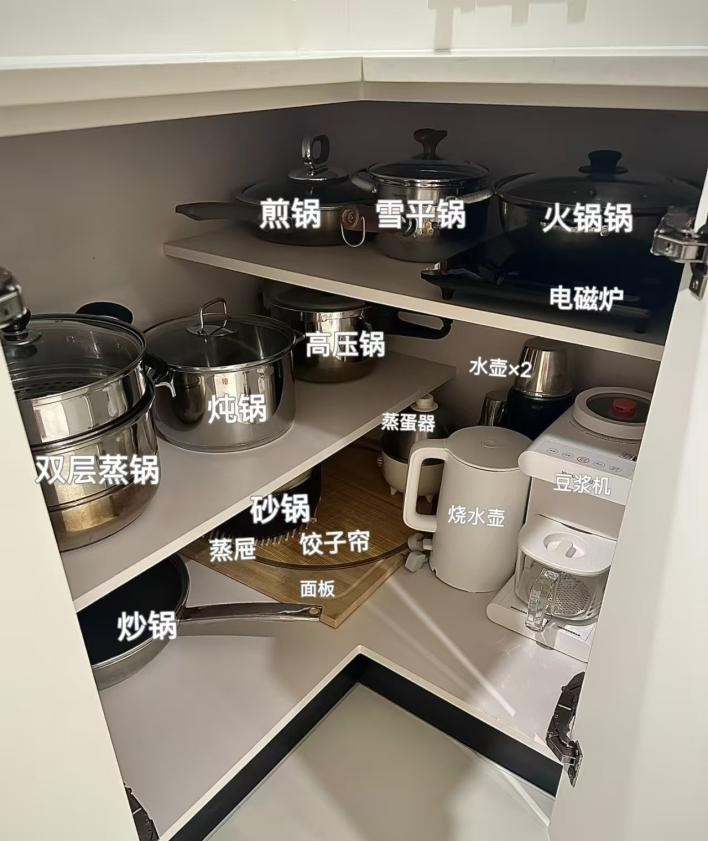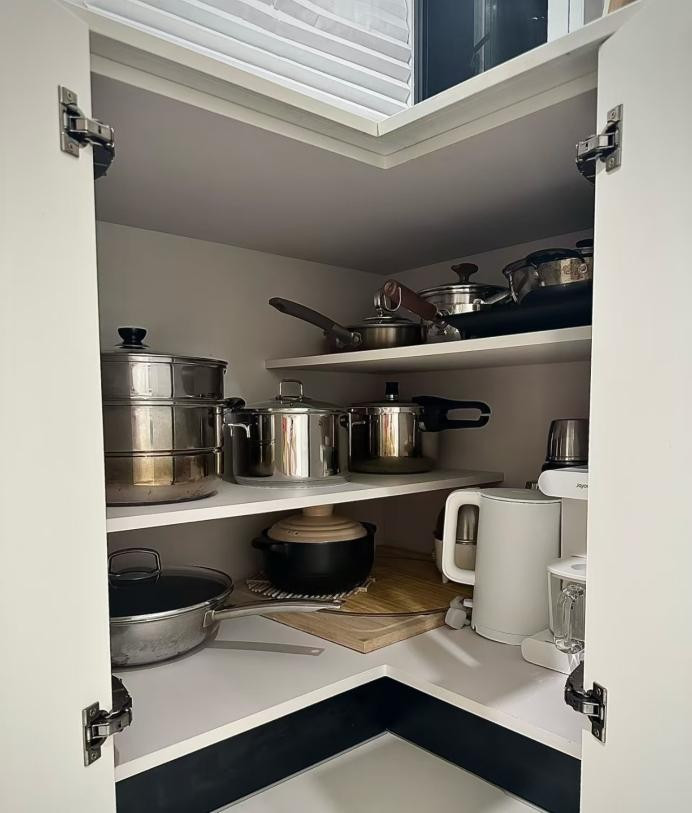或者,像这个网友@胖虎接把转角内部改成错层层板,根据锅具大小做高低分区,炒锅、汤锅、煎锅各就各位,原本闲置的空间一下子被利用的恰到好处!