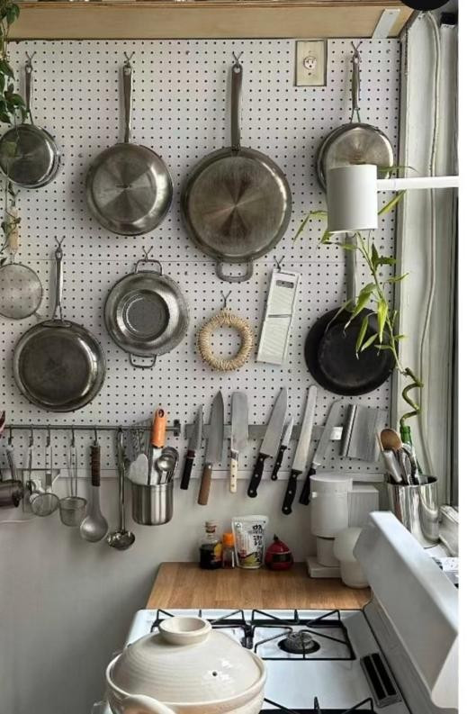 但网友@爱吃梨的实际操作直接打脸,一排挂钩,锅按使用频率排好队。