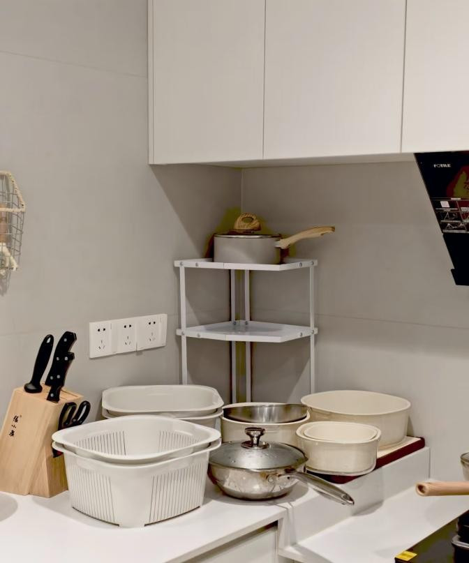 但网友@小微的家直接把转角当成了锅具专属位,L型台面拐角处,放一个转角置物架,锅一层一层斜着靠,挺好拿的。