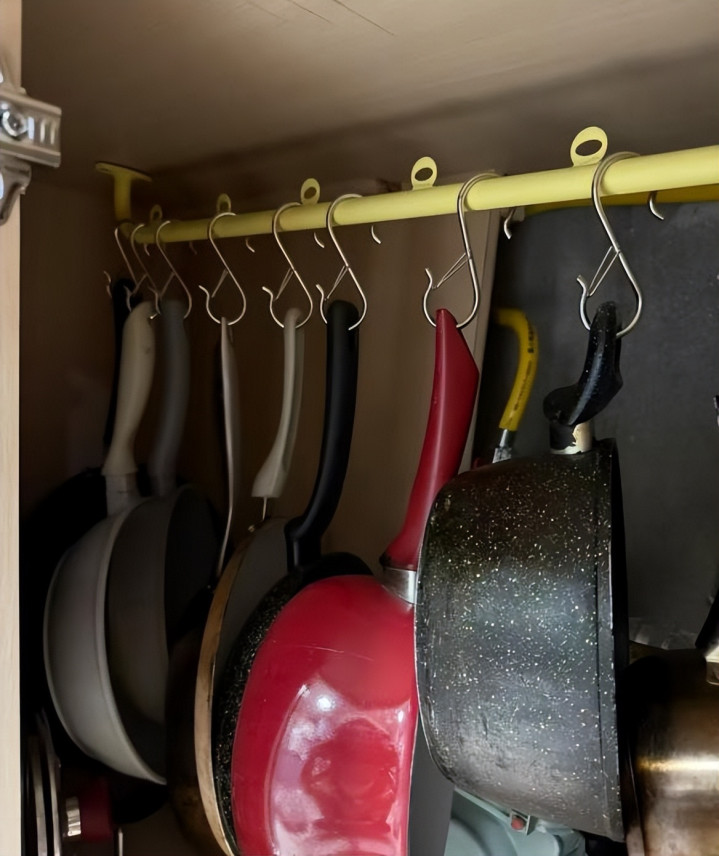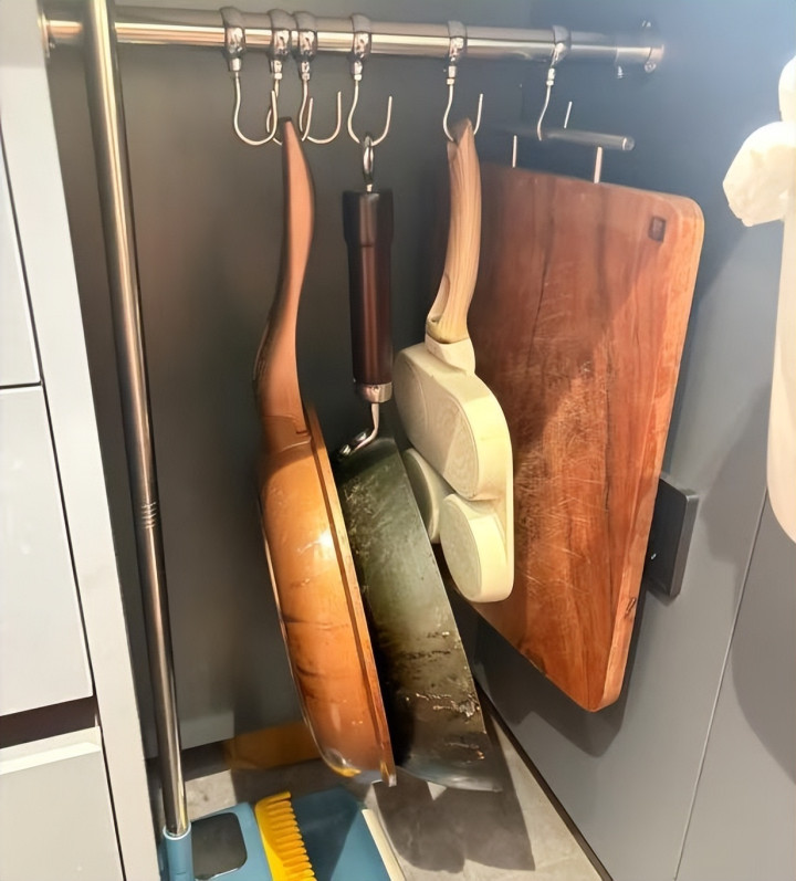 把伸缩杆装在橱柜里,或者找一块顺手的空位,直接把原本横着、叠着放的锅具,改成垂直悬挂。